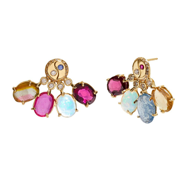 YIN-YANG FAN EARRINGS features oval ruby, tourmaline, garnets and opals in prong settings. Yin-yang studs with faceted ruby, blue sapphire, and diamonds.